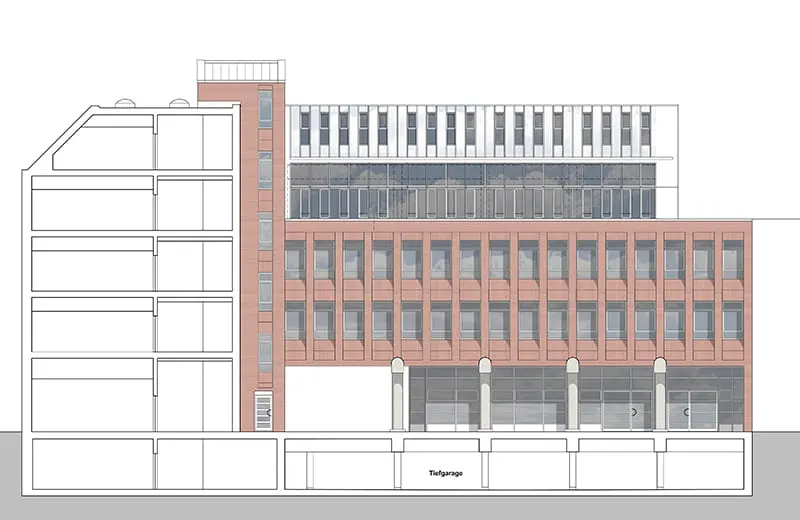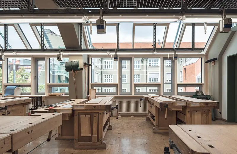 Erweiterungsbau, 4-5 geschossig, Klinkerbau mit großen Dachverglasungen, große Werkstatt- und Unterrichtsräume für Schreiner, Meisterschule Schreiner, Kaminkehrer, Meisterschule für Orthopädie; Unterbauung des Grundstücks mit Tiefgarage, Baujahr 1980-1982